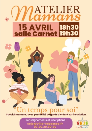 Le Service Enfance Jeunesse et Education invite toutes les mamans à s’accorder une pause rien que pour elles le mercredi 15 avril de 18h30 à 19h30 à la salle Carnot. Un moment convivial d’échanges et de partage, dans une ambiance bienveillante.