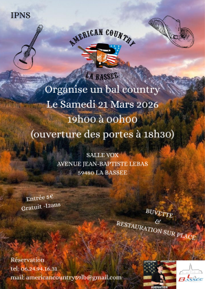 Retenez la date ! Le samedi 21 mars 2026 à la Salle VOX, L'American Country La Bassée vous fera danser au rythme des sons texans lors de son fameux Bal Country.
