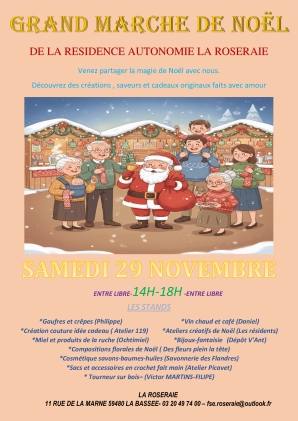 La résidence autonomie La Roseraie donne le coup d’envoi des marchés de Noël ce samedi 29 novembre ! De 14h à 18h, venez flâner entre les stands et débuter vos emplettes de fin d’année dans un cadre chaleureux et convivial.
